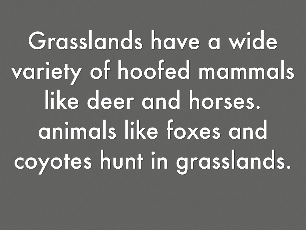 Grasslands have a wide variety of hoofed mammals like deer and horses. animals like foxes and coyotes hunt in grasslands.