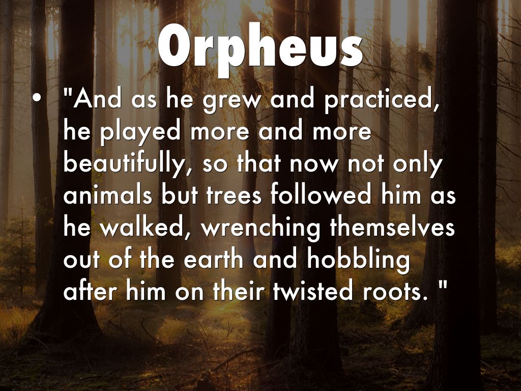 • "And as he grew and practiced, he played more and more beautifully, so that now not only animals but trees followed him as he walked, wrenching themselves out of the earth and hobbling after him on their twisted roots. "