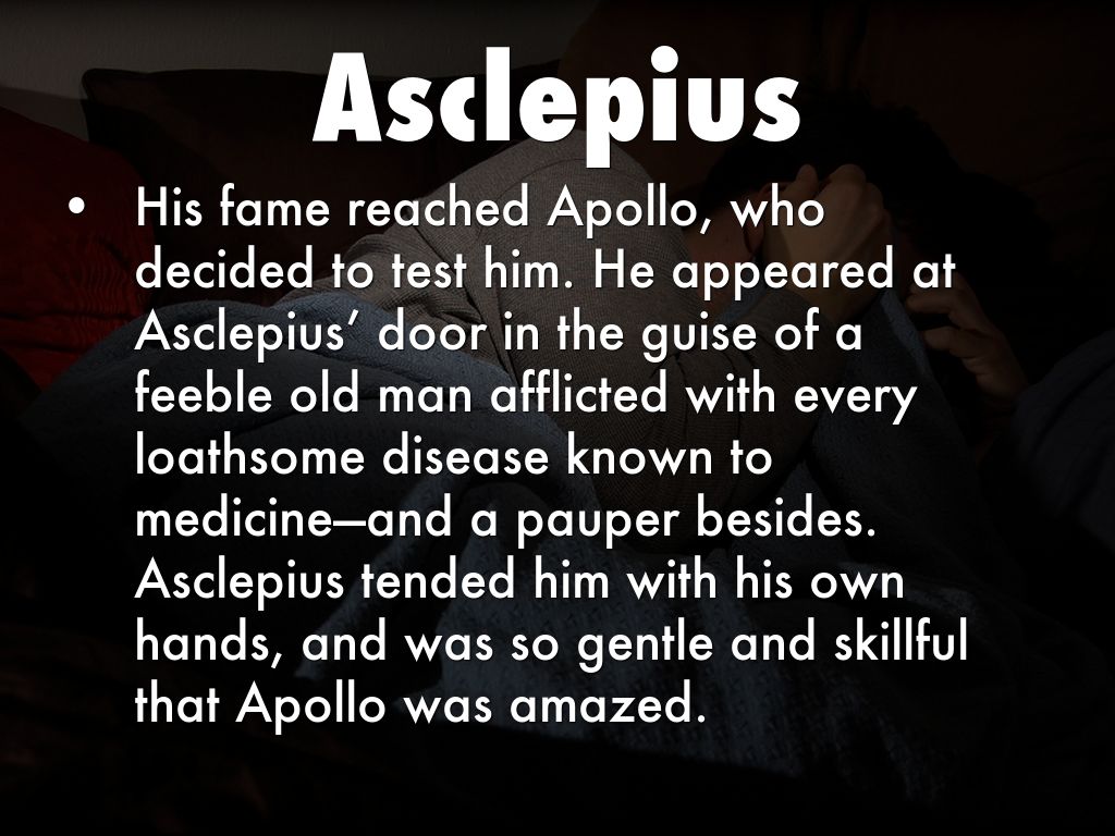 • His fame reached Apollo, who decided to test him. He appeared at Asclepius’ door in the guise of a feeble old man afflicted with every loathsome disease known to medicine—and a pauper besides. Asclepius tended him with his own hands, and was so gentle and skillful that Apollo was amazed.