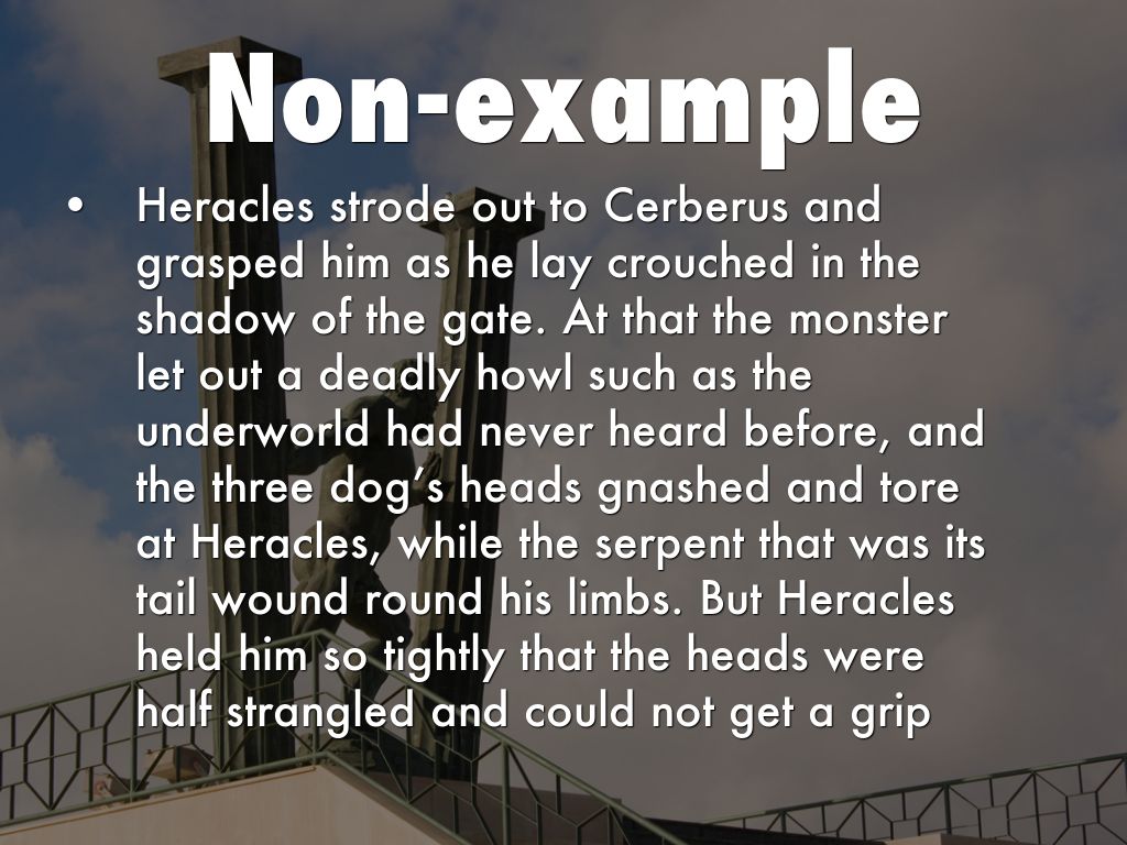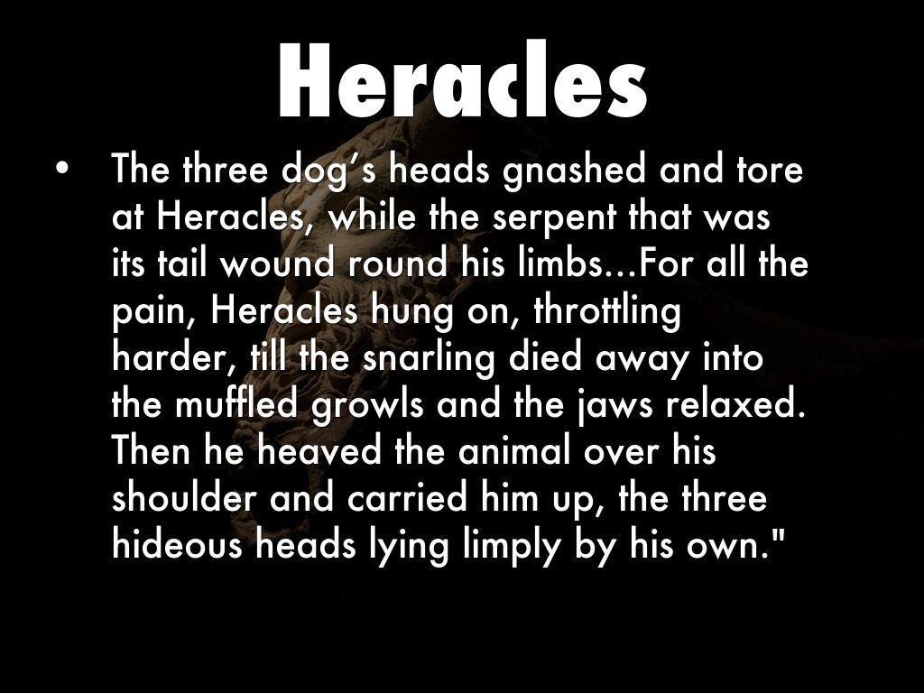 • The three dog’s heads gnashed and tore at Heracles, while the serpent that was its tail wound round his limbs...For all the pain, Heracles hung on, throttling harder, till the snarling died away into the muffled growls and the jaws relaxed. Then he heaved the animal over his shoulder and carried him up, the three hideous heads lying limply by his own."