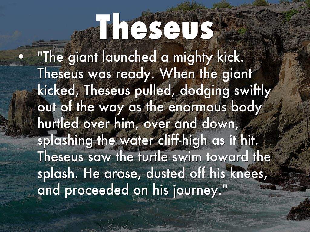 • "The giant launched a mighty kick. Theseus was ready. When the giant kicked, Theseus pulled, dodging swiftly out of the way as the enormous body hurtled over him, over and down, splashing the water cliff-high as it hit. Theseus saw the turtle swim toward the splash. He arose, dusted off his knees, and proceeded on his journey."