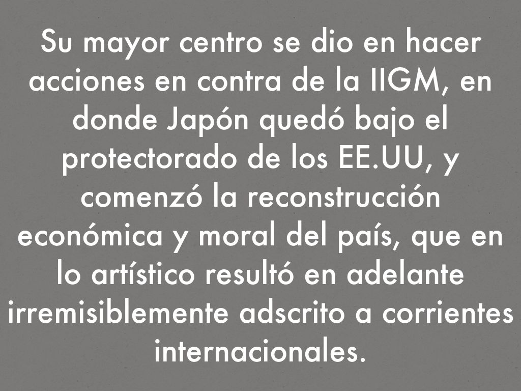Su mayor centro se dio en hacer acciones en contra de la IIGM, en donde Japón quedó bajo el protectorado de los EE.UU, y comenzó la reconstrucción económica y moral del país, que en lo artístico resultó en adelante irremisiblemente adscrito a corrientes internacionales.