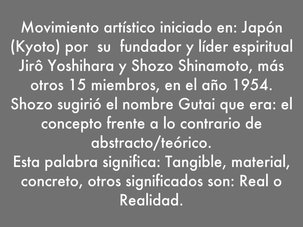 Los miembros de Gutai trabajaron tanto la pintura como la intervención en los materiales de la vida cotidiana, elemento muy característico de la estética japonesa. En este sentido, estuvieron muy influidos por el Surrealismo del que partía Yoshihara, y por el Art Informel.