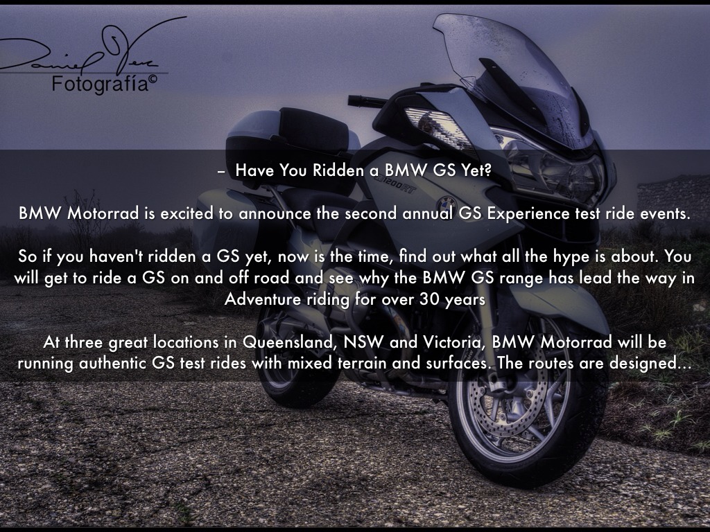 At three great locations in Queensland, NSW and Victoria, BMW Motorrad will be running authentic GS test rides with mixed terrain and surfaces. The routes are designed to give riders a chance to experience the legendary BMW GS models in their natural habitat an experience that's difficult to replicate on a test ride in the city.