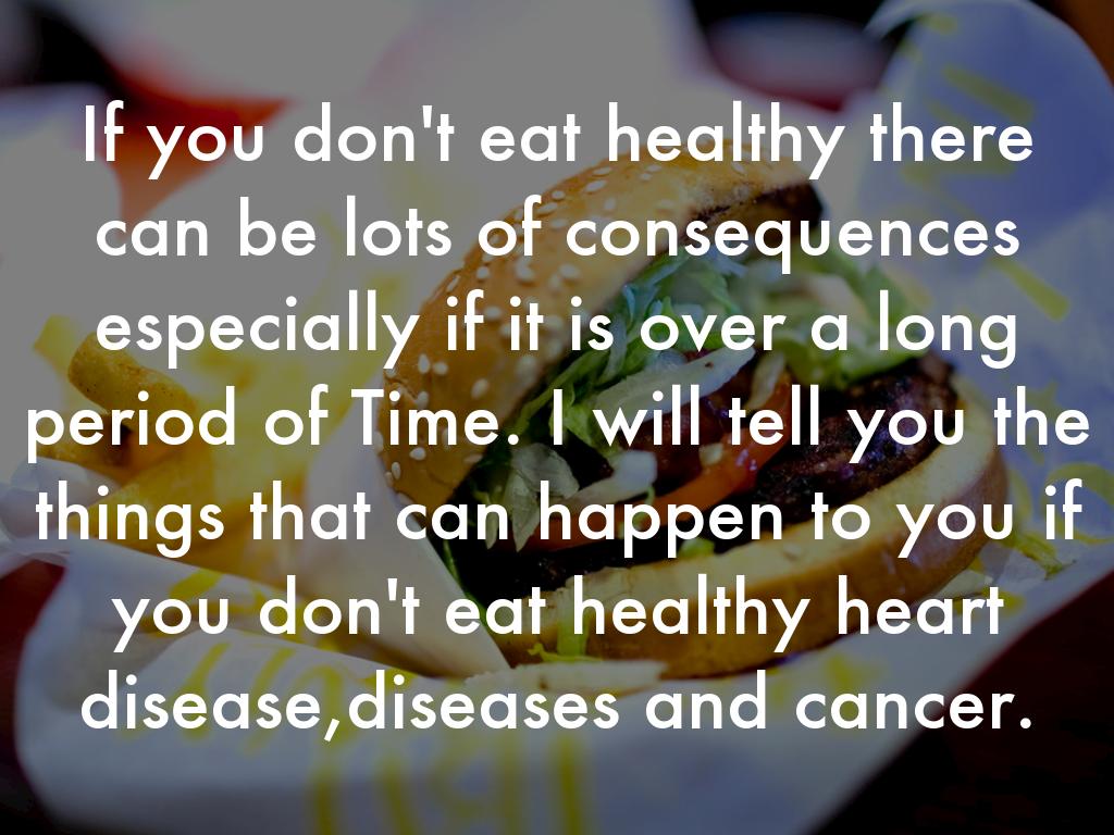 If you don't eat healthy there can be lots of consequences especially if it is over a long period of Time. I will tell you the things that can happen to you if you don't eat healthy heart disease,diseases and cancer.