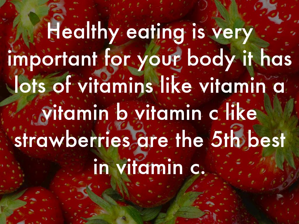 Healthy eating is very important for your body it has lots of vitamins like vitamin a vitamin b vitamin c like strawberries are the 5th best in vitamin c.