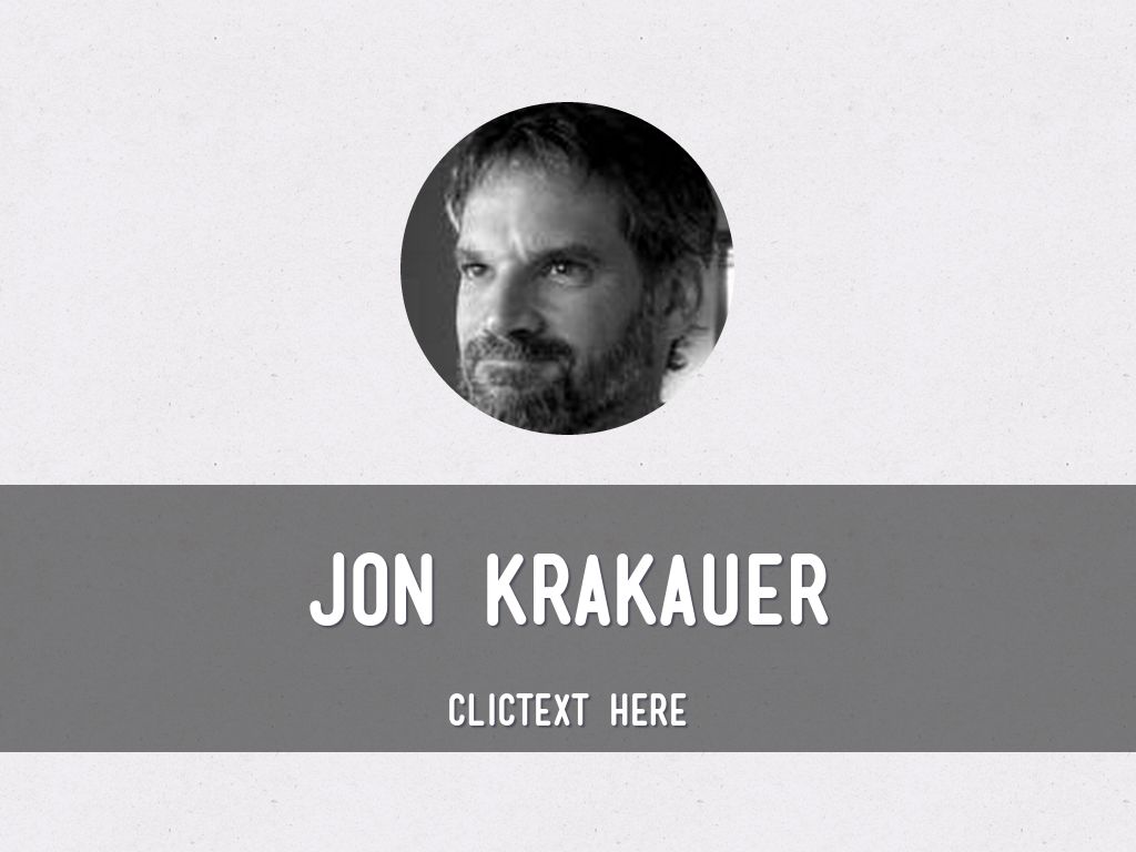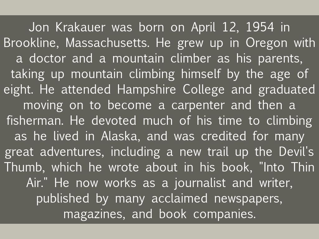 Jon Krakauer was born on April 12, 1954 in Brookline, Massachusetts. He grew up in Oregon with a doctor and a mountain climber as his parents, taking up mountain climbing himself by the age of eight. He attended Hampshire College and graduated moving on to become a carpenter and then a fisherman. He devoted much of his time to climbing as he lived in Alaska, and was credited for many great adventures, including a new trail up the Devil's Thumb, which he wrote about in his book, "Into Thin Air." He now works as a journalist and writer, published by many acclaimed newspapers, magazines, and book companies.