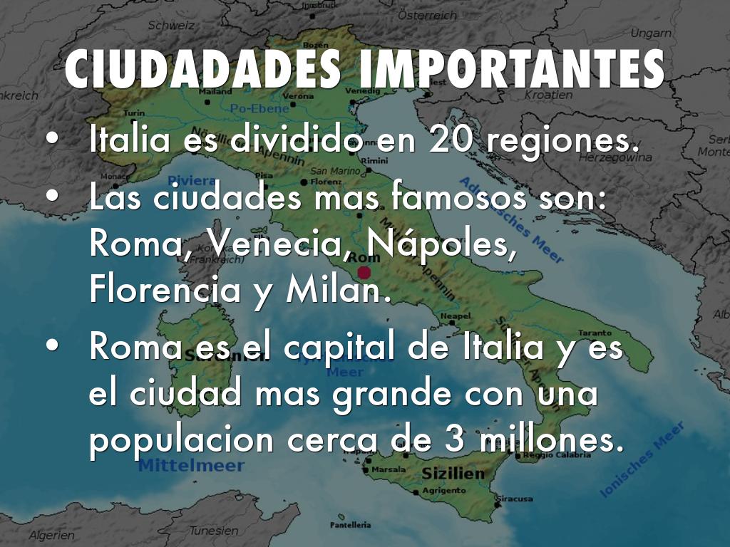 • Las ciudades mas famosos son: Roma, Venecia, Nápoles, Florencia y Milan.