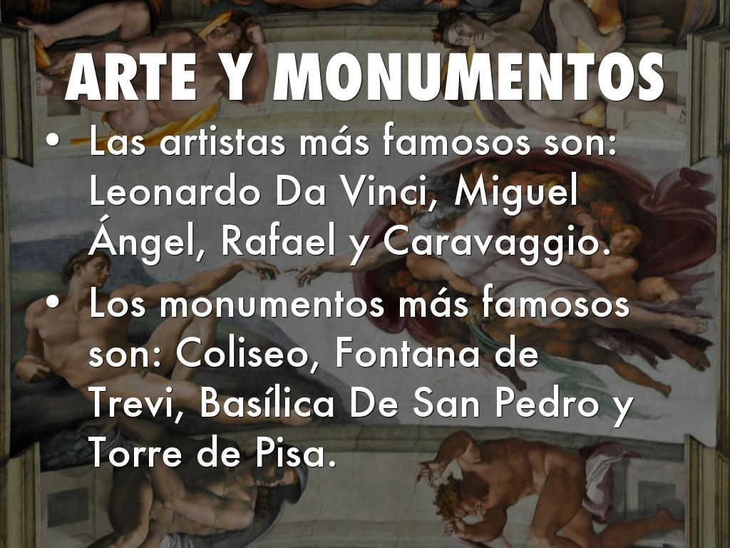 • Los monumentos más famosos son: Coliseo, Fontana de Trevi, Basílica De San Pedro y Torre de Pisa.