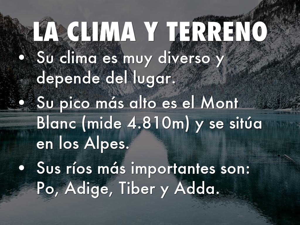 • Italia es un país Mediterráneo localizado al sur del continente europeo.