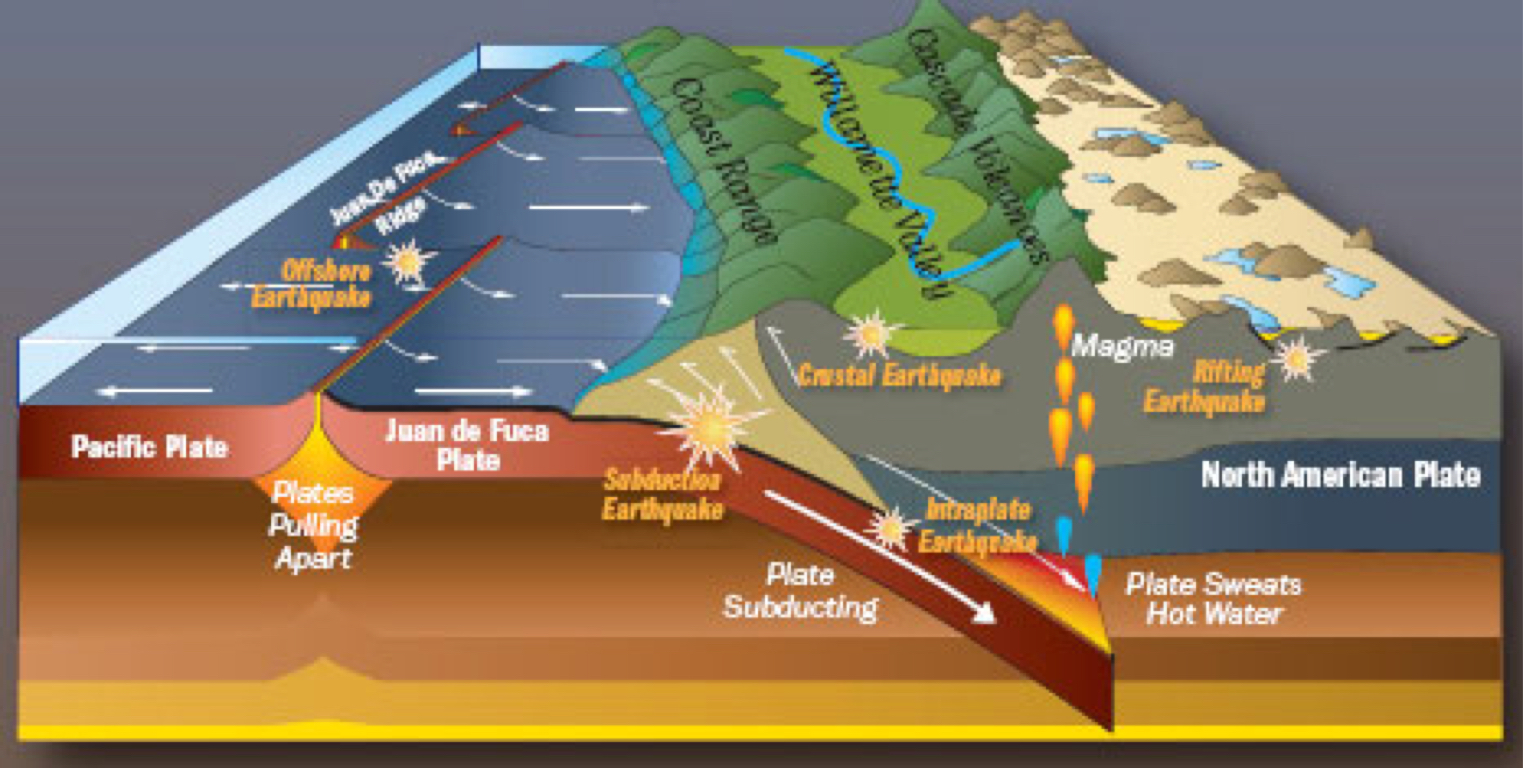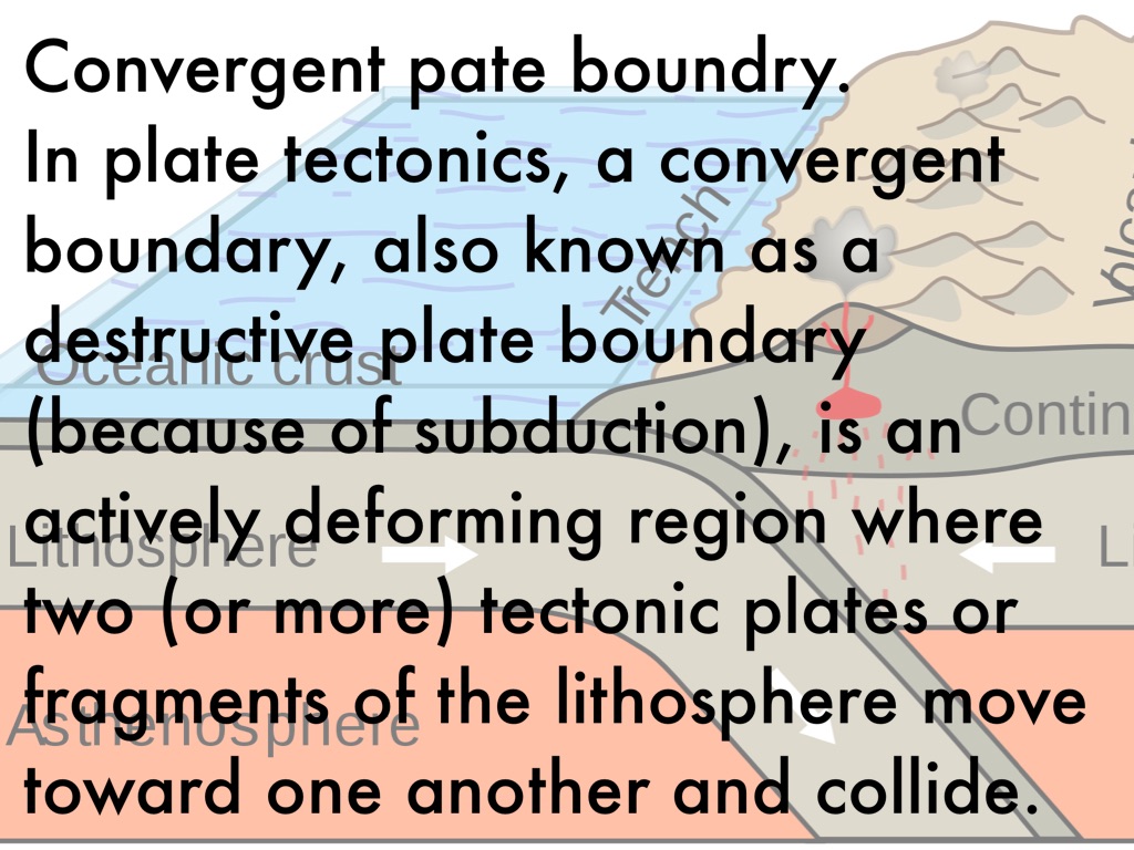 In plate tectonics, a convergent boundary, also known as a destructive plate boundary (because of subduction), is an actively deforming region where two (or more) tectonic plates or fragments of the lithosphere move toward one another and collide.