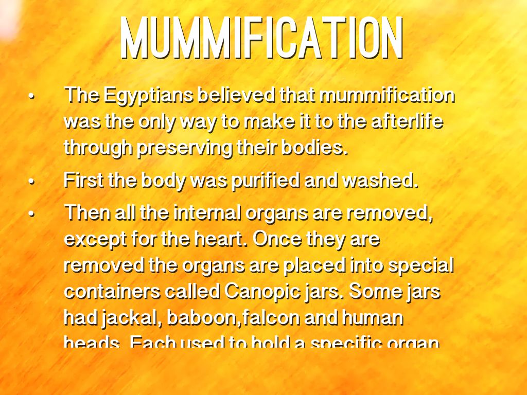• The Egyptians believed that mummification was the only way to make it to the afterlife through preserving their bodies.