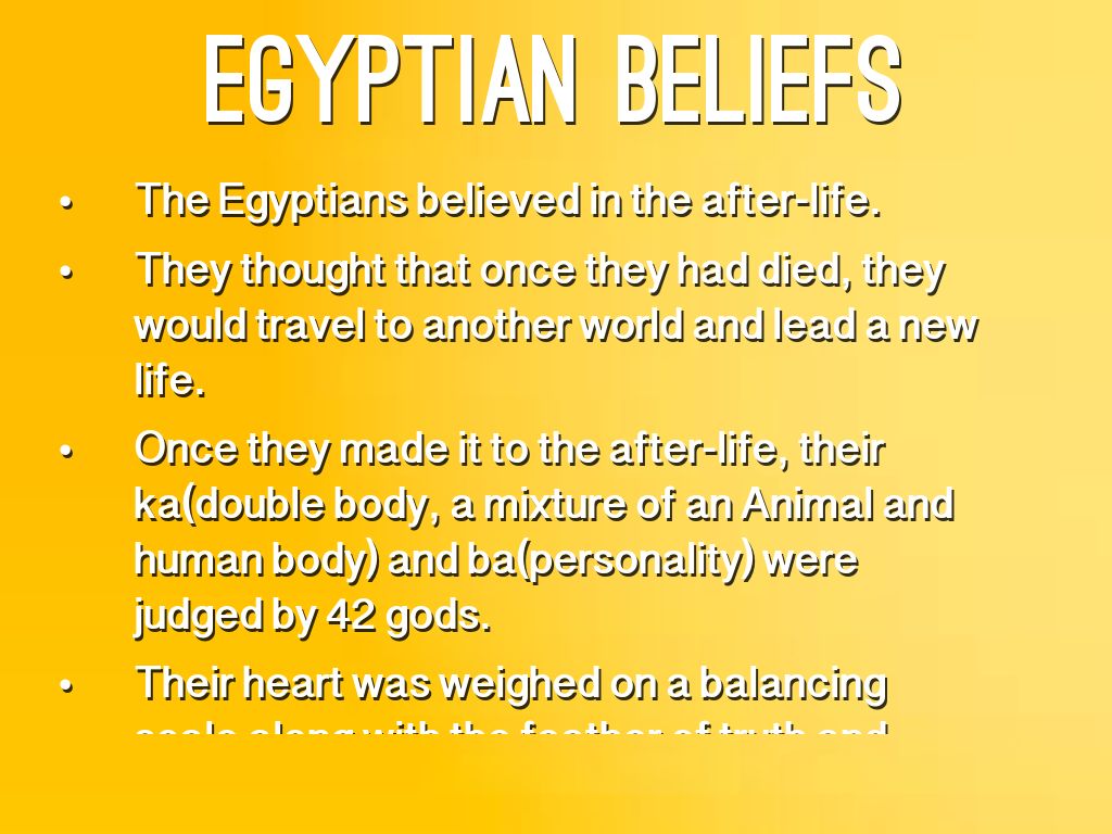 • Once they made it to the after-life, their ka(double body, a mixture of an Animal and human body) and ba(personality) were judged by 42 gods.