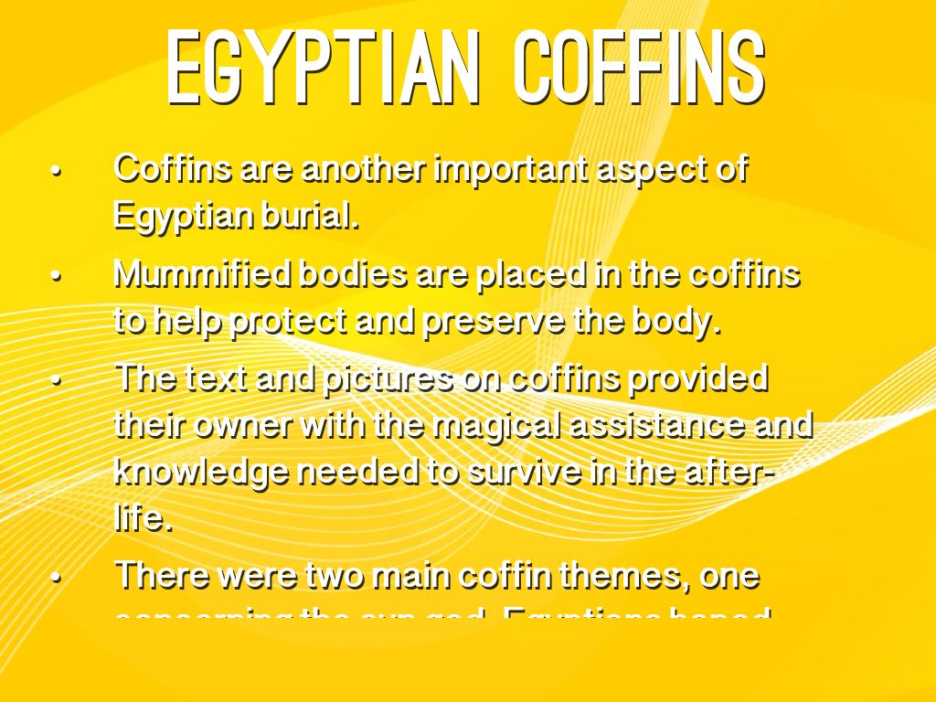 • There were two main coffin themes, one concerning the sun god. Egyptians hoped that after death they might ascend to the sky and accompany him on his journey by day and through the underworld by night.