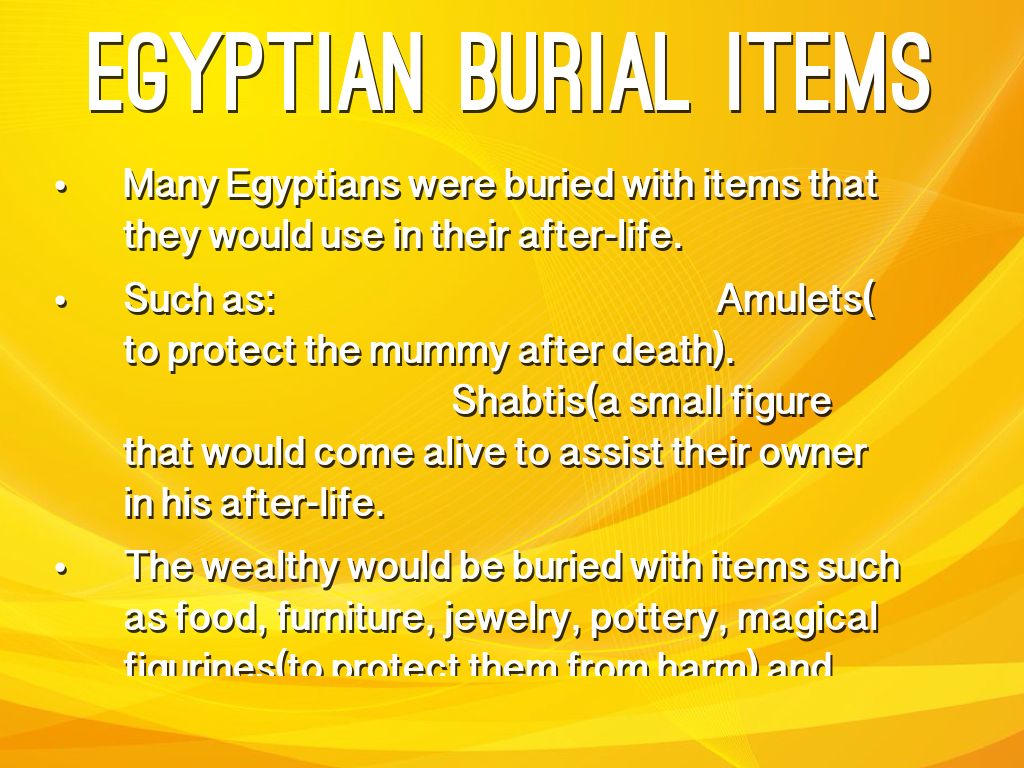 • Such as: Amulets( to protect the mummy after death). Shabtis(a small figure that would come alive to assist their owner in his after-life.
