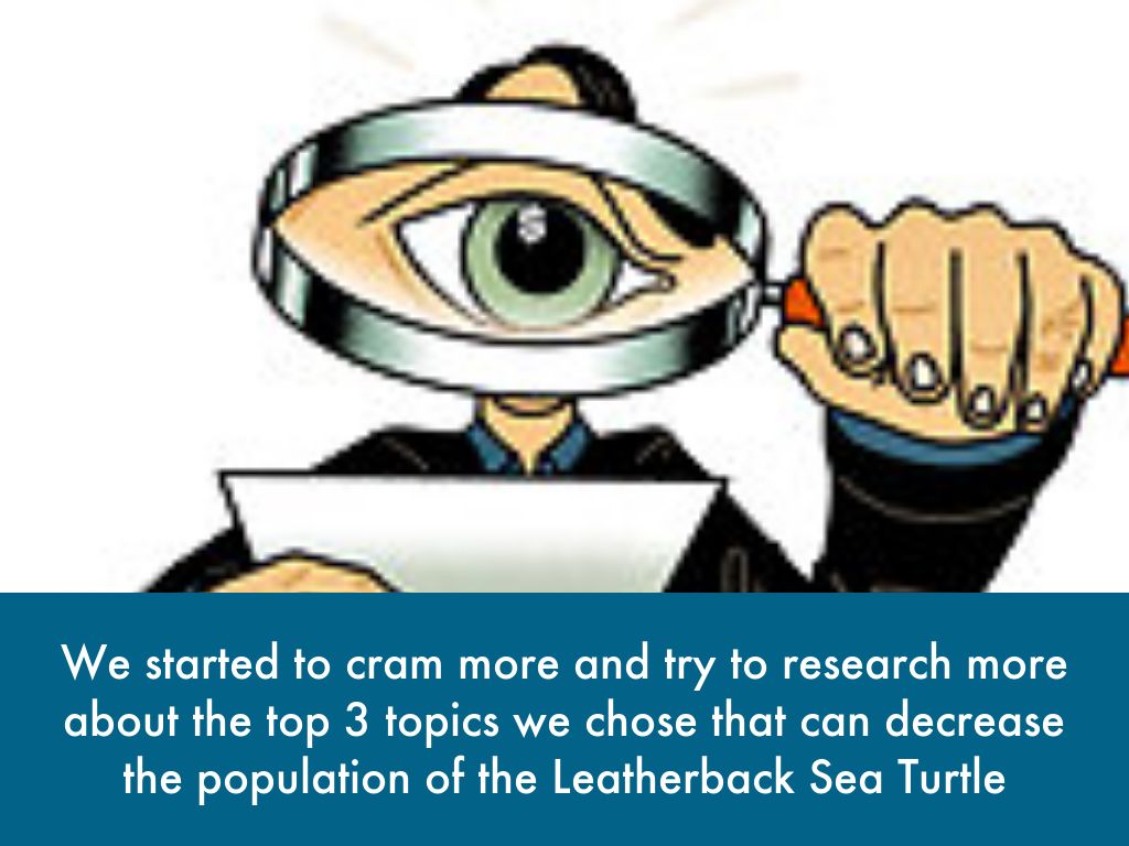 We started to cram more and try to research more about the top 3 topics we chose that can decrease the population of the Leatherback Sea Turtle