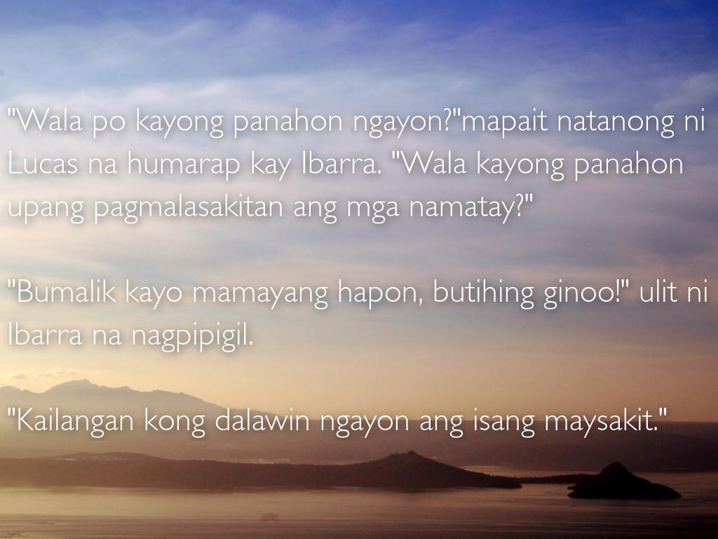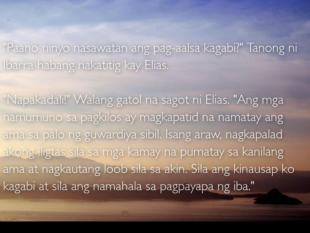 "Napakadali!" Walang gatol na sagot ni Elias. "Ang mga namumuno sa pagkilos ay magkapatid na namatay ang ama sa palo ng guwardiya sibil. Isang araw, nagkapalad akong iligtas sila sa mga kamay na pumatay sa kanilang ama at nagkautang loob sila sa akin. Sila ang kinausap ko kagabi at sila ang namahala sa pagpayapa ng iba."