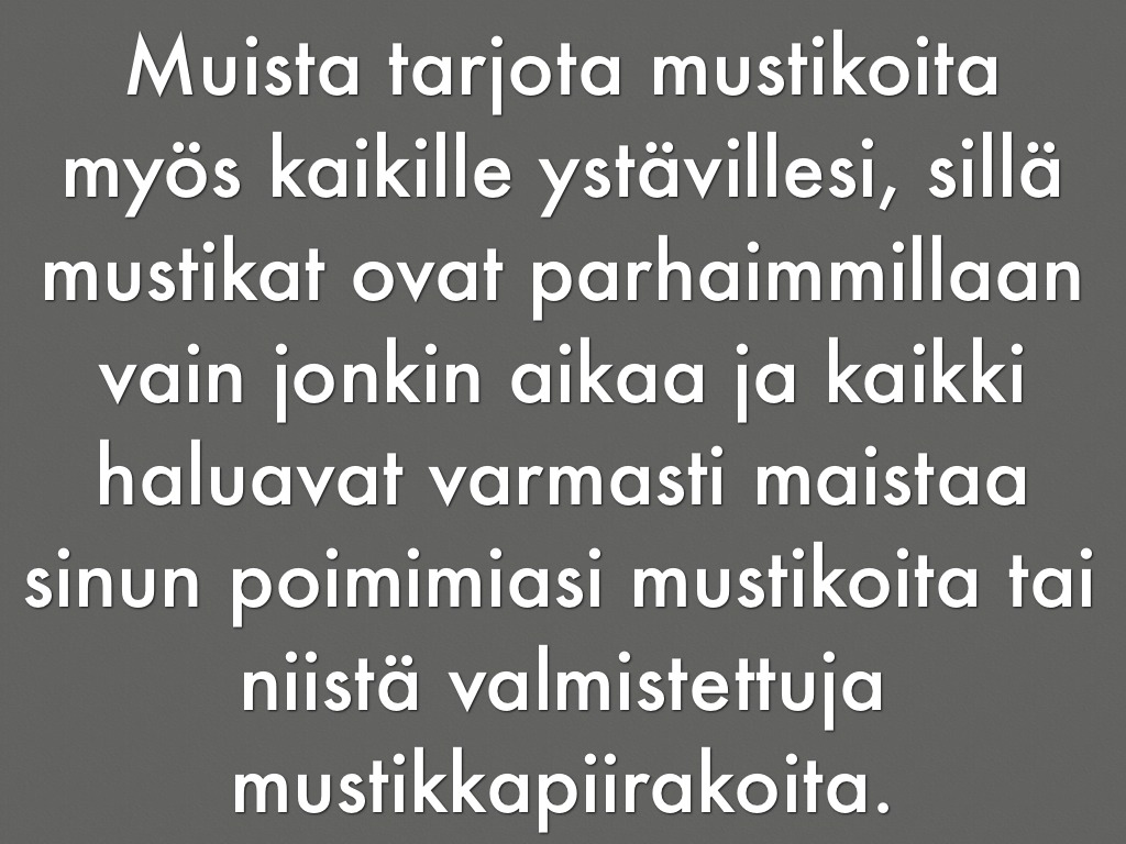 Muista tarjota mustikoita myös kaikille ystävillesi, sillä mustikat ovat parhaimmillaan vain jonkin aikaa ja kaikki haluavat varmasti maistaa sinun poimimiasi mustikoita tai niistä valmistettuja mustikkapiirakoita.
