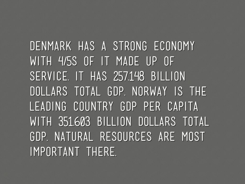 Denmark has a strong economy with 4/5s of it made up of service. It has 257.148 billion dollars total GDP. Norway is the leading country GDP per capita with 351.603 billion dollars total GDP. Natural resources are most important there.