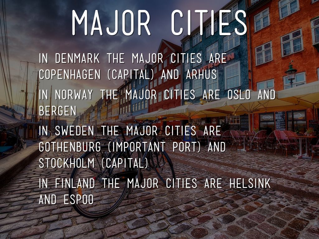 In Denmark the major cities are Copenhagen (capital) and Arhus