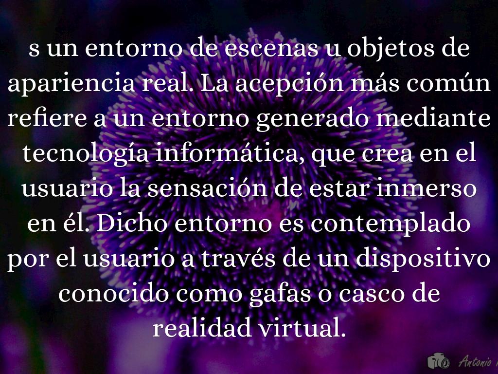 s un entorno de escenas u objetos de apariencia real. La acepción más común refiere a un entorno generado mediante tecnología informática, que crea en el usuario la sensación de estar inmerso en él. Dicho entorno es contemplado por el usuario a través de un dispositivo conocido como gafas o casco de realidad virtual.