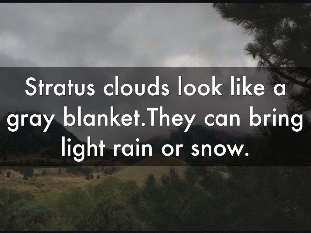 Stratus clouds look like a gray blanket.They can bring light rain or snow.