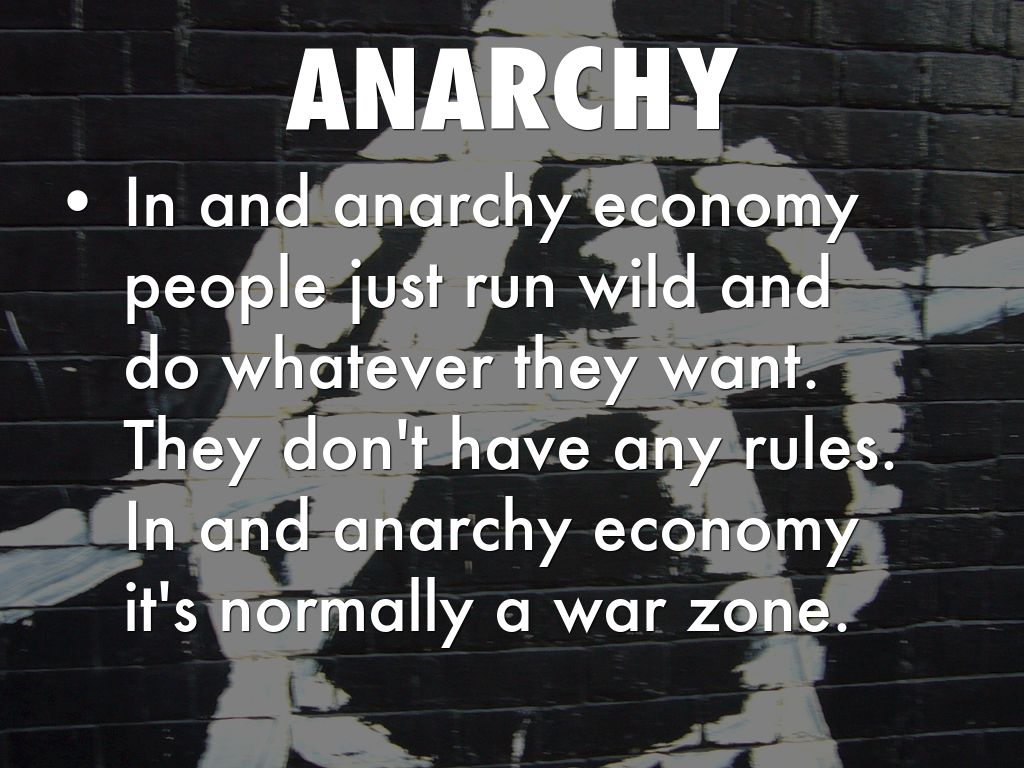 In and anarchy economy people just run wild and do whatever they want. People have their freedom and can do whatever they want. They don't have anyone running them and telling them what to do.