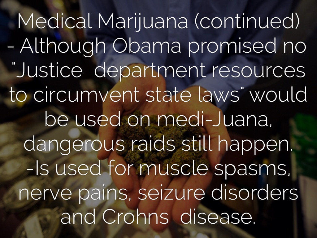 - Although Obama promised no "Justice department resources to circumvent state laws" would be used on medi-Juana, dangerous raids still happen.
