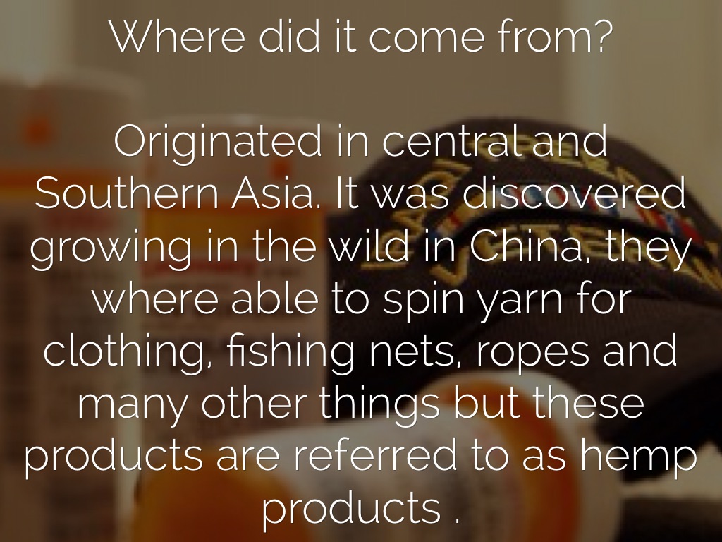 Originated in central and Southern Asia. It was discovered growing in the wild in China, they where able to spin yarn for clothing, fishing nets, ropes and many other things but these products are referred to as hemp products .