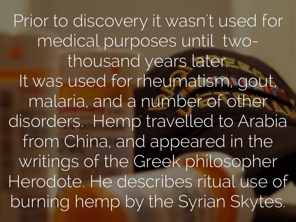 It was used for rheumatism, gout, malaria, and a number of other disorders. Hemp travelled to Arabia from China, and appeared in the writings of the Greek philosopher Herodote. He describes ritual use of burning hemp by the Syrian Skytes.