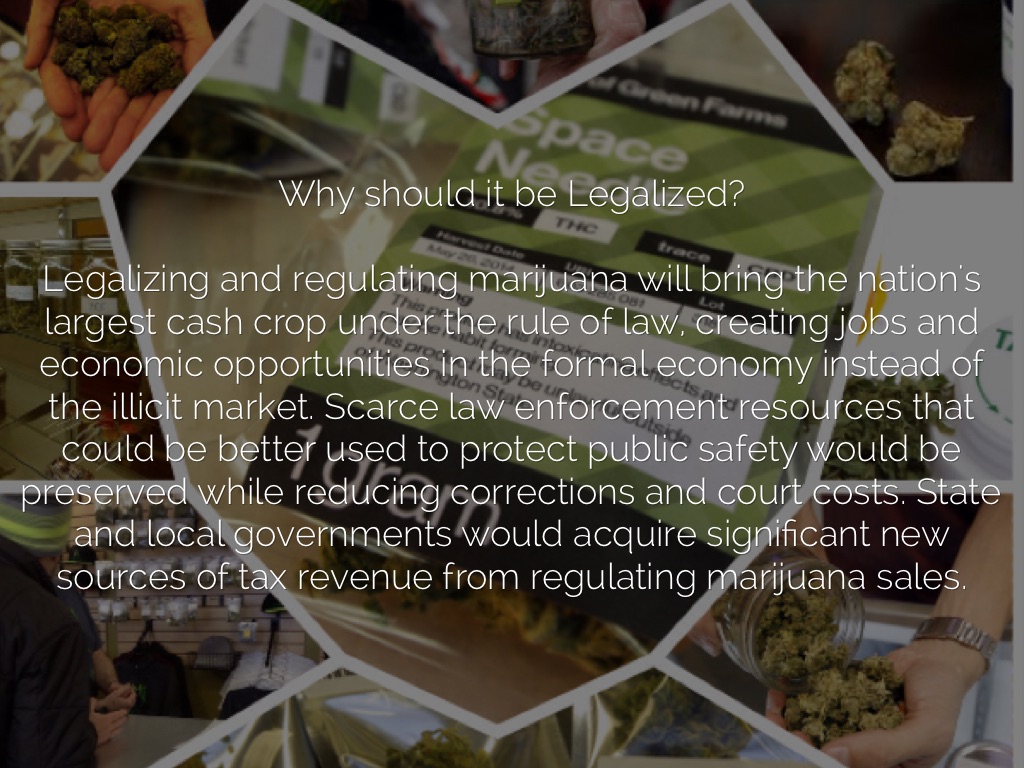 Legalizing and regulating marijuana will bring the nation's largest cash crop under the rule of law, creating jobs and economic opportunities in the formal economy instead of the illicit market. Scarce law enforcement resources that could be better used to protect public safety would be preserved while reducing corrections and court costs. State and local governments would acquire significant new sources of tax revenue from regulating marijuana sales.