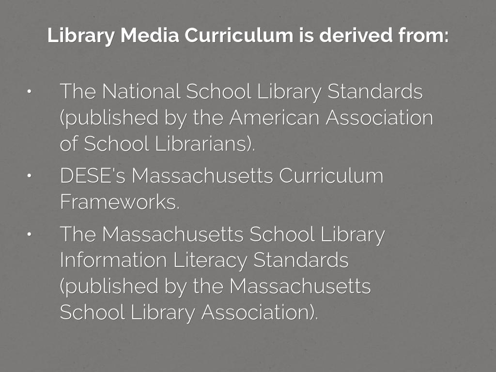 • The Massachusetts School Library Information Literacy Standards (published by the Massachusetts School Library Association).