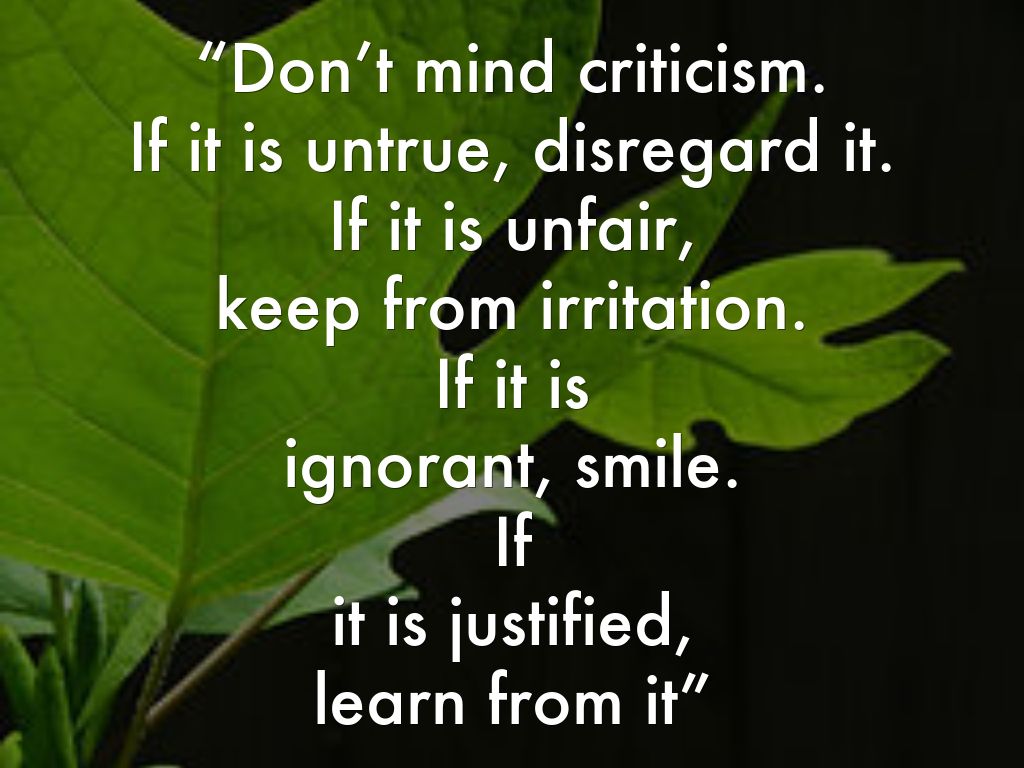 “Don’t mind criticism. If it is untrue, disregard it. If it is unfair, keep from irritation. If it is ignorant, smile. If it is justified, learn from it”