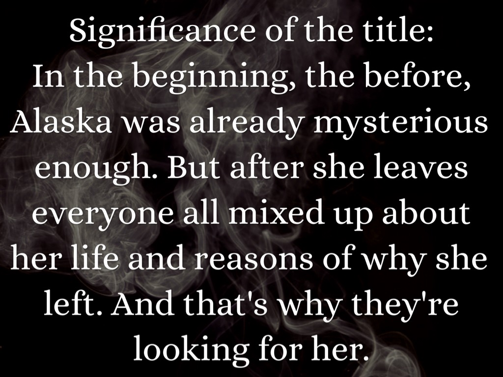 Significance of the title: In the beginning, the before, Alaska was already mysterious enough. But after she leaves everyone all mixed up about her life and reasons of why she left. And that's why they're looking for her.