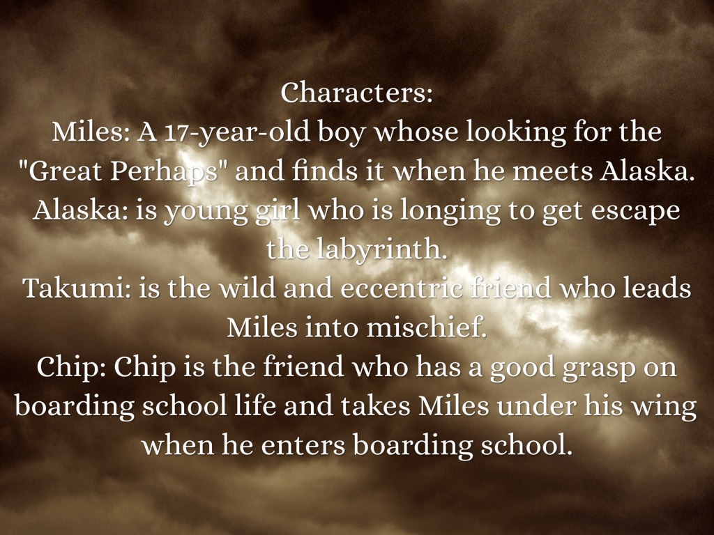 Characters: Miles: A 17-year-old boy whose looking for the "Great Perhaps" and finds it when he meets Alaska. Alaska: is young girl who is longing to get escape the labyrinth. Takumi: is the wild and eccentric friend who leads Miles into mischief. Chip: Chip is the friend who has a good grasp on boarding school life and takes Miles under his wing when he enters boarding school.