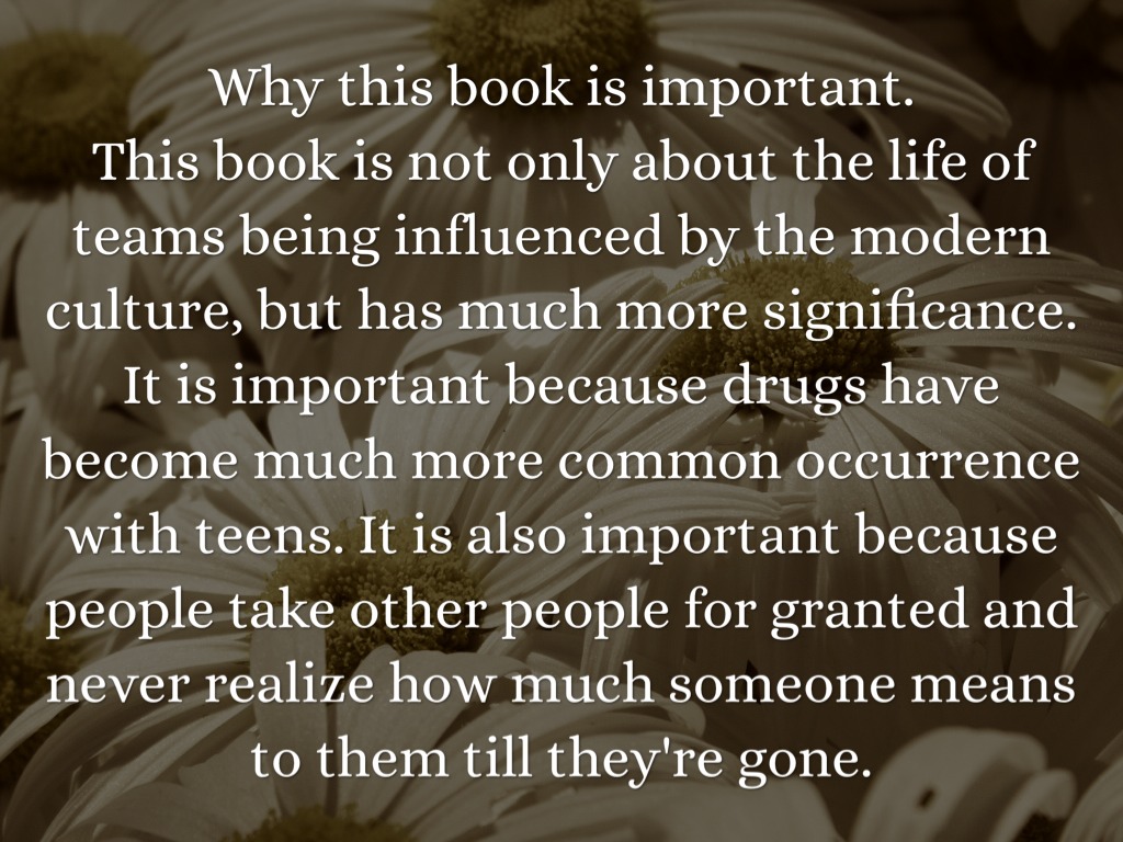 Why this book is important. This book is not only about the life of teams being influenced by the modern culture, but has much more significance. It is important because drugs have become much more common occurrence with teens. It is also important because people take other people for granted and never realize how much someone means to them till they're gone.