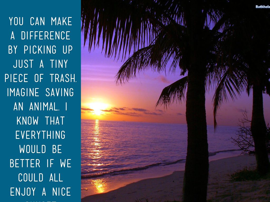 You can make a difference by picking up just a tiny piece of trash. Imagine saving an animal. I know that everything would be better if we could all enjoy a nice sunset