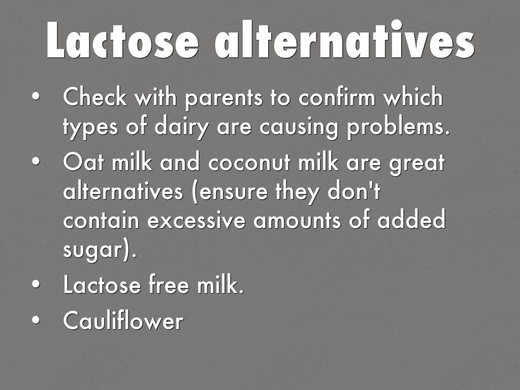 Each child will have different requirements when it comes to lactose intolerance. For example, many children with this condition can still consume cheese and yoghurt and are often okay with milk in baking but cannot tolerate glasses of milk. It is always best to check with parents and gather specific information (this will make your job in the kitchen much easier).