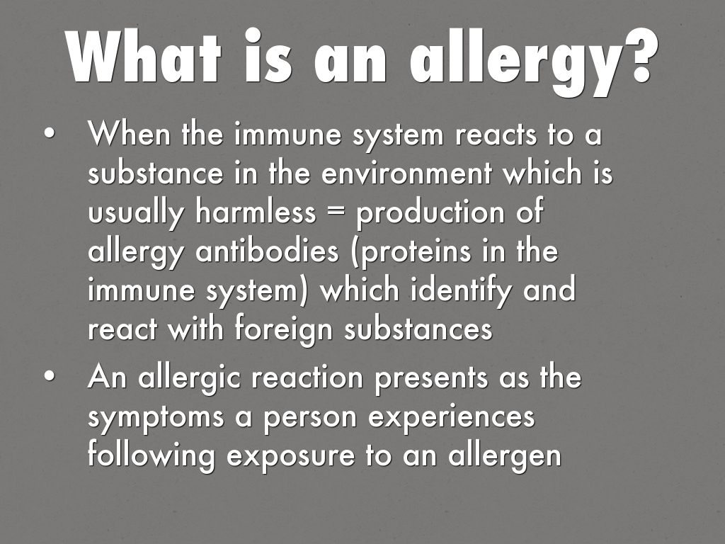• When the immune system reacts to a substance in the environment which is usually harmless = production of allergy antibodies (proteins in the immune system) which identify and react with foreign substances