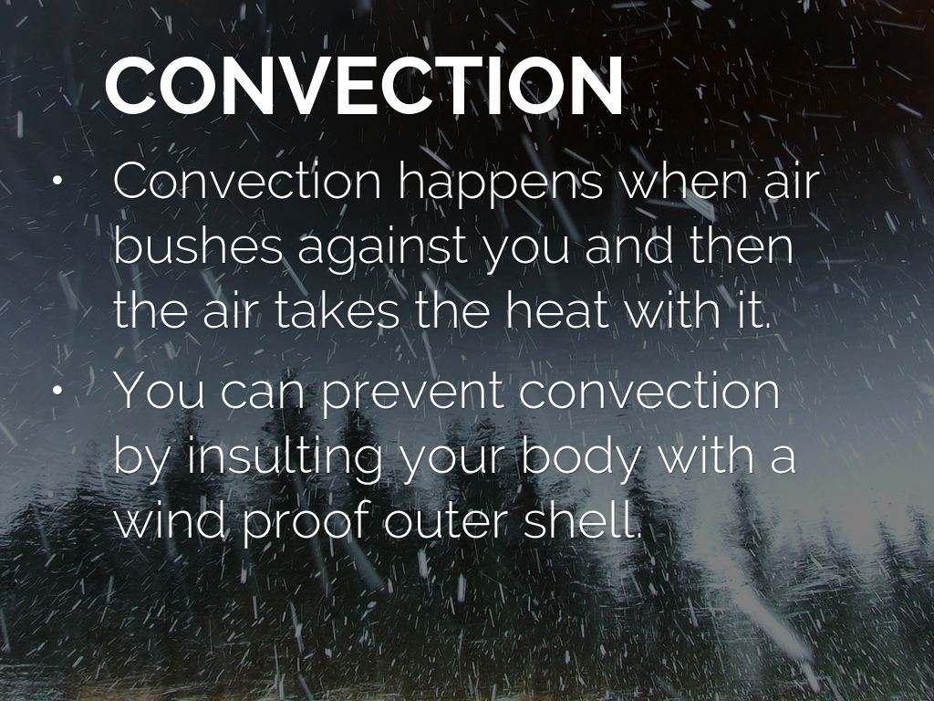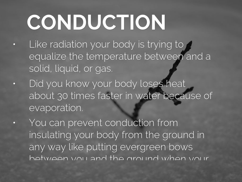 You can prevent conduction from insulating your body from the ground in any way like putting evergreen bows between you and the ground when your sleeping.
