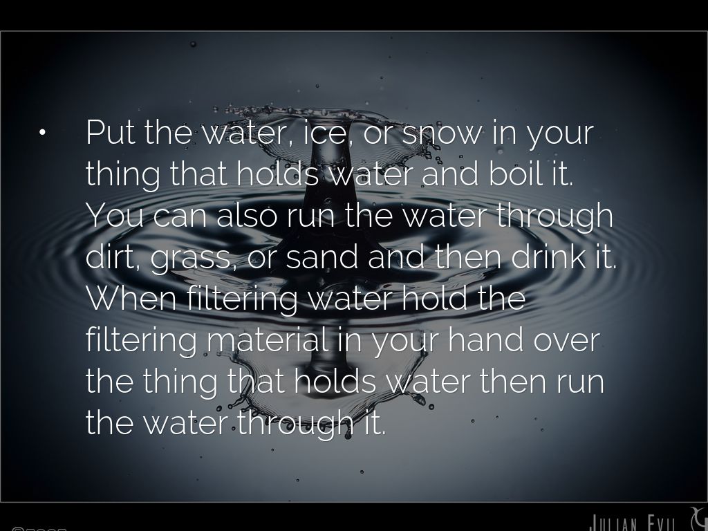 Put the water, ice, or snow in your thing that holds water and boil it. You can also run the water through dirt, grass, or sand and then drink it. When filtering water hold the filtering material in your hand over the thing that holds water then run the water through it.