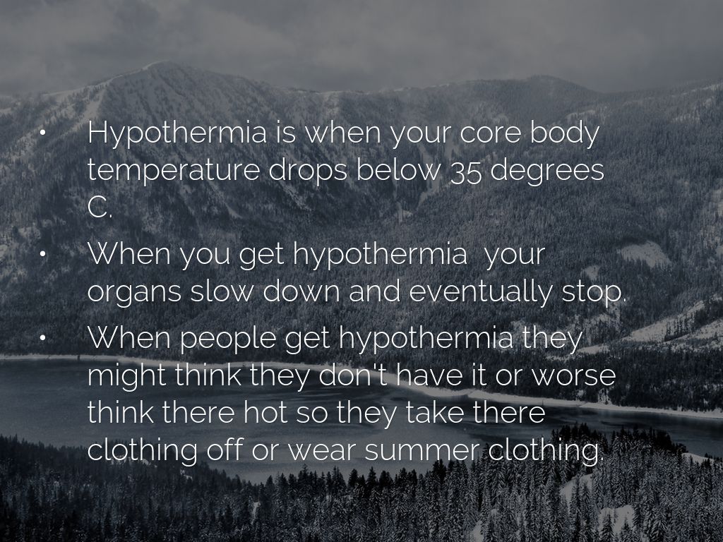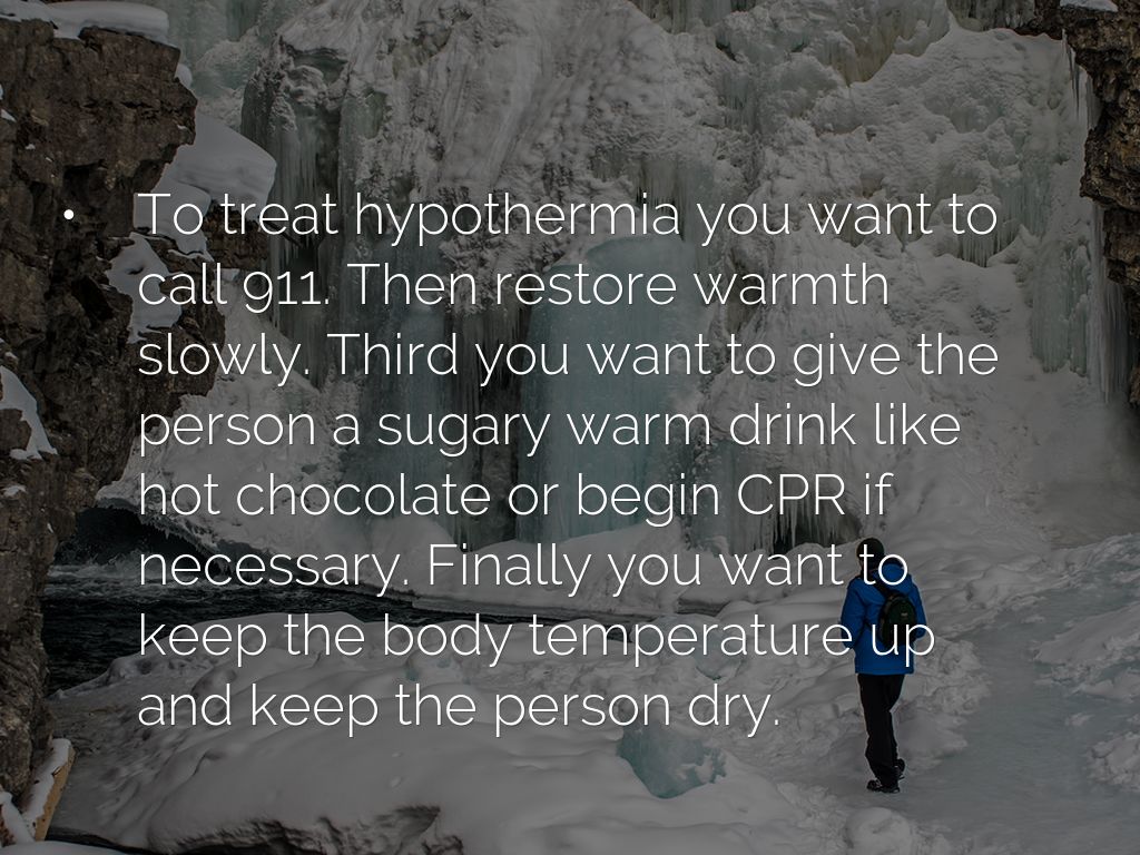 To treat hypothermia you want to call 911. Then restore warmth slowly. Third you want to give the person a sugary warm drink like hot chocolate or begin CPR if necessary. Finally you want to keep the body temperature up and keep the person dry.