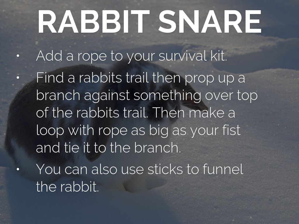 Find a rabbits trail then prop up a branch against something over top of the rabbits trail. Then make a loop with rope as big as your fist and tie it to the branch.