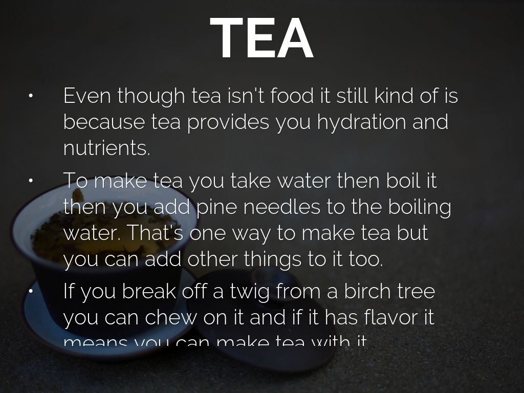 To make tea you take water then boil it then you add pine needles to the boiling water. That's one way to make tea but you can add other things to it too.