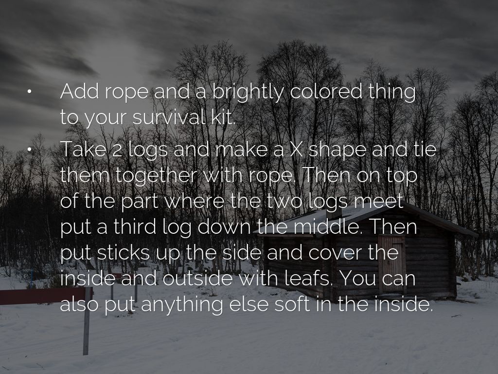 To make a fire in the snow you have to dig out a hole in the snow then find anything dry and put the hardest things to burn on the bottom.