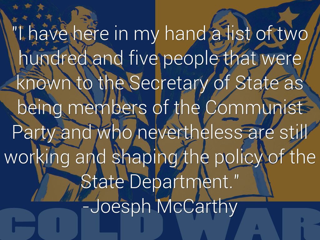 "I have here in my hand a list of two hundred and five people that were known to the Secretary of State as being members of the Communist Party and who nevertheless are still working and shaping the policy of the State Department." -Joesph McCarthy
