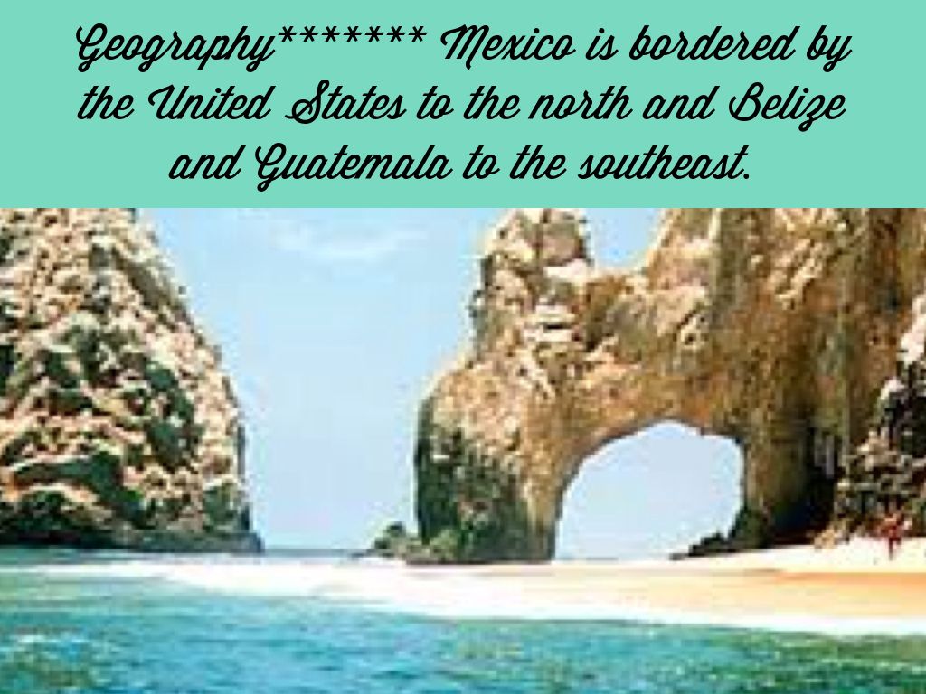 Geography******* Mexico is bordered by the United States to the north and Belize and Guatemala to the southeast.