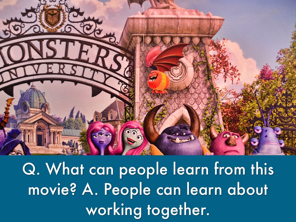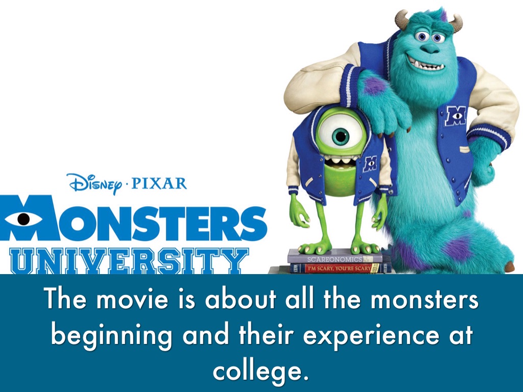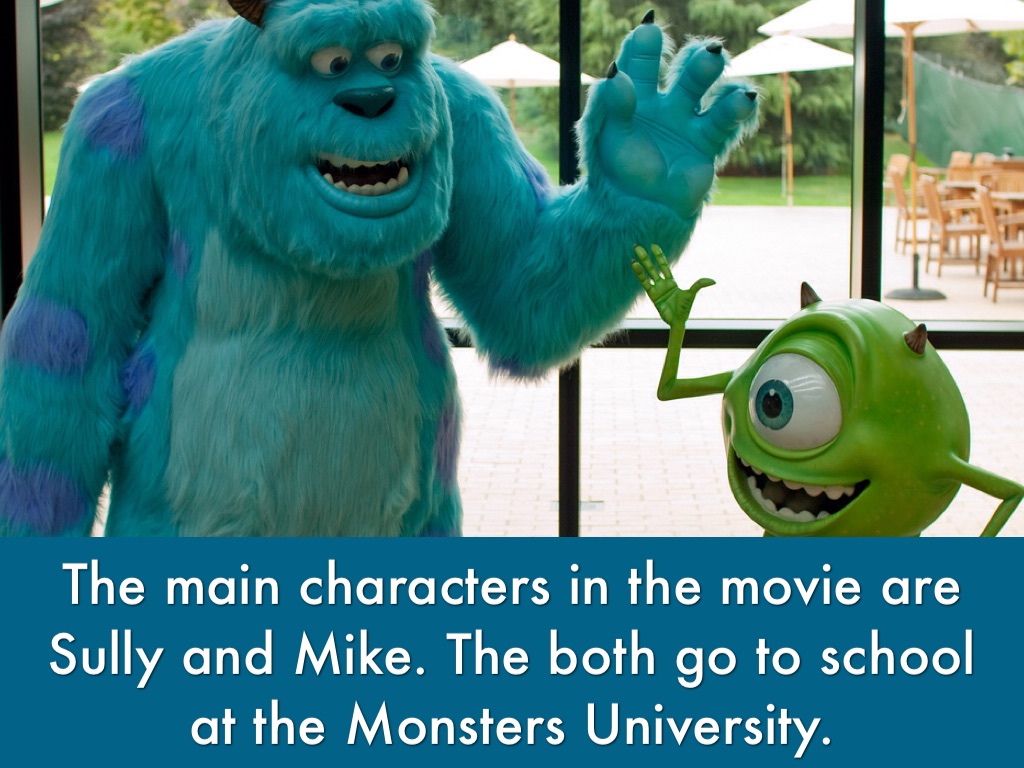 The main characters in the movie are Sully and Mike. The both go to school at the Monsters University.