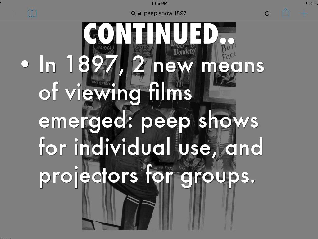 • In 1897, 2 new means of viewing films emerged: peep shows for individual use, and projectors for groups.