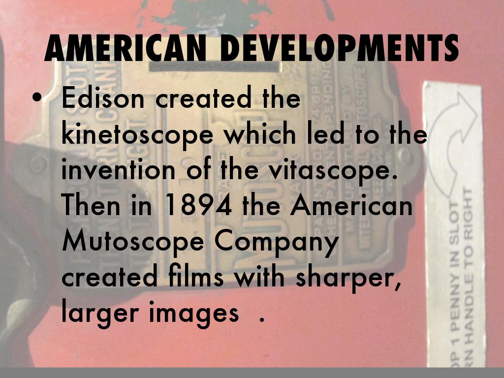 • Edison created the kinetoscope which led to the invention of the vitascope. Then in 1894 the American Mutoscope Company created films with sharper, larger images .